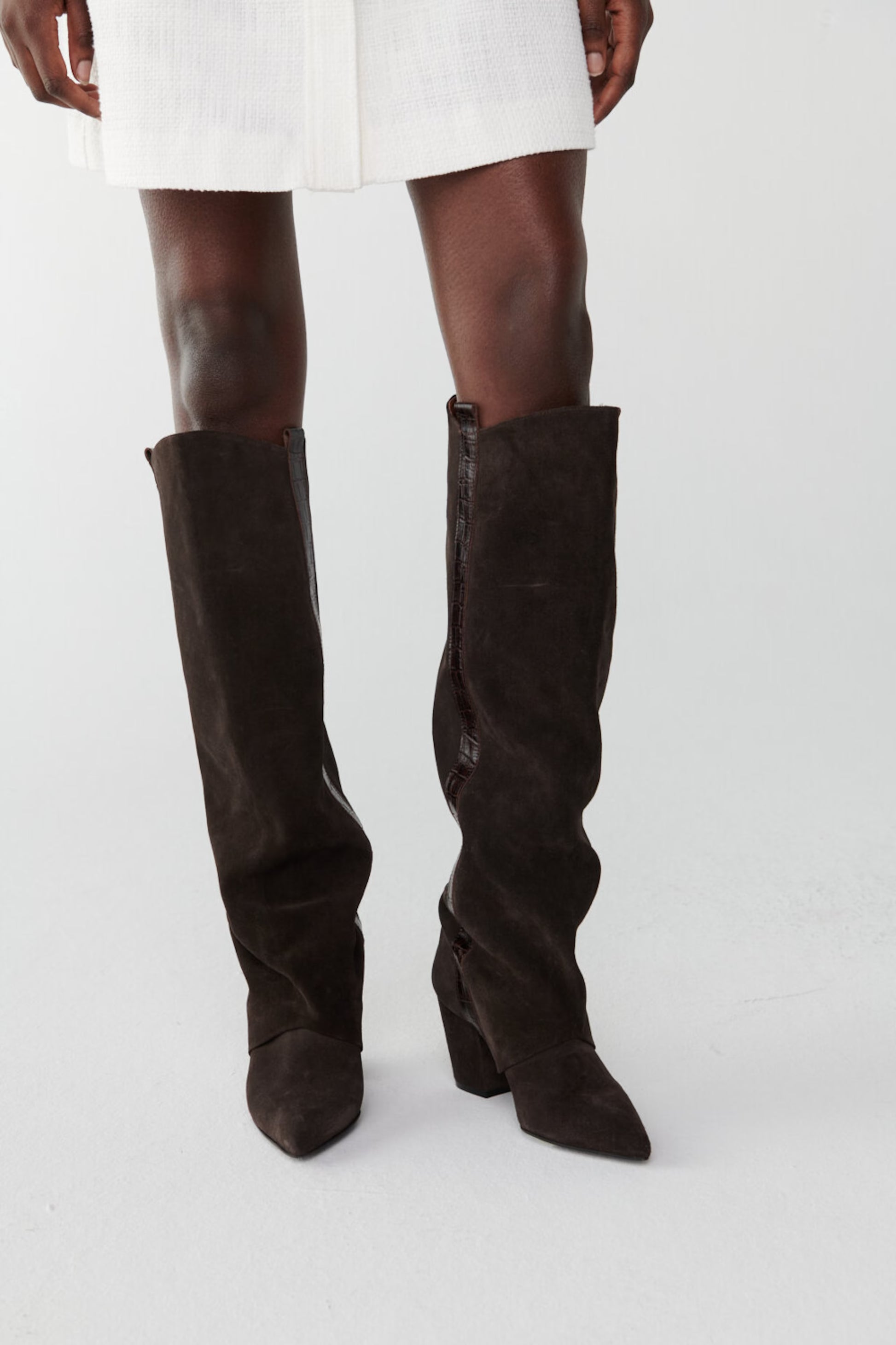 Bonn is a brown suede high boot with a PU leather side strap detail. It has a pointed toe and a wide and long shaft to wear, either slouched or straight. The heel heght is 8 cm. Shaft height: 43 cm