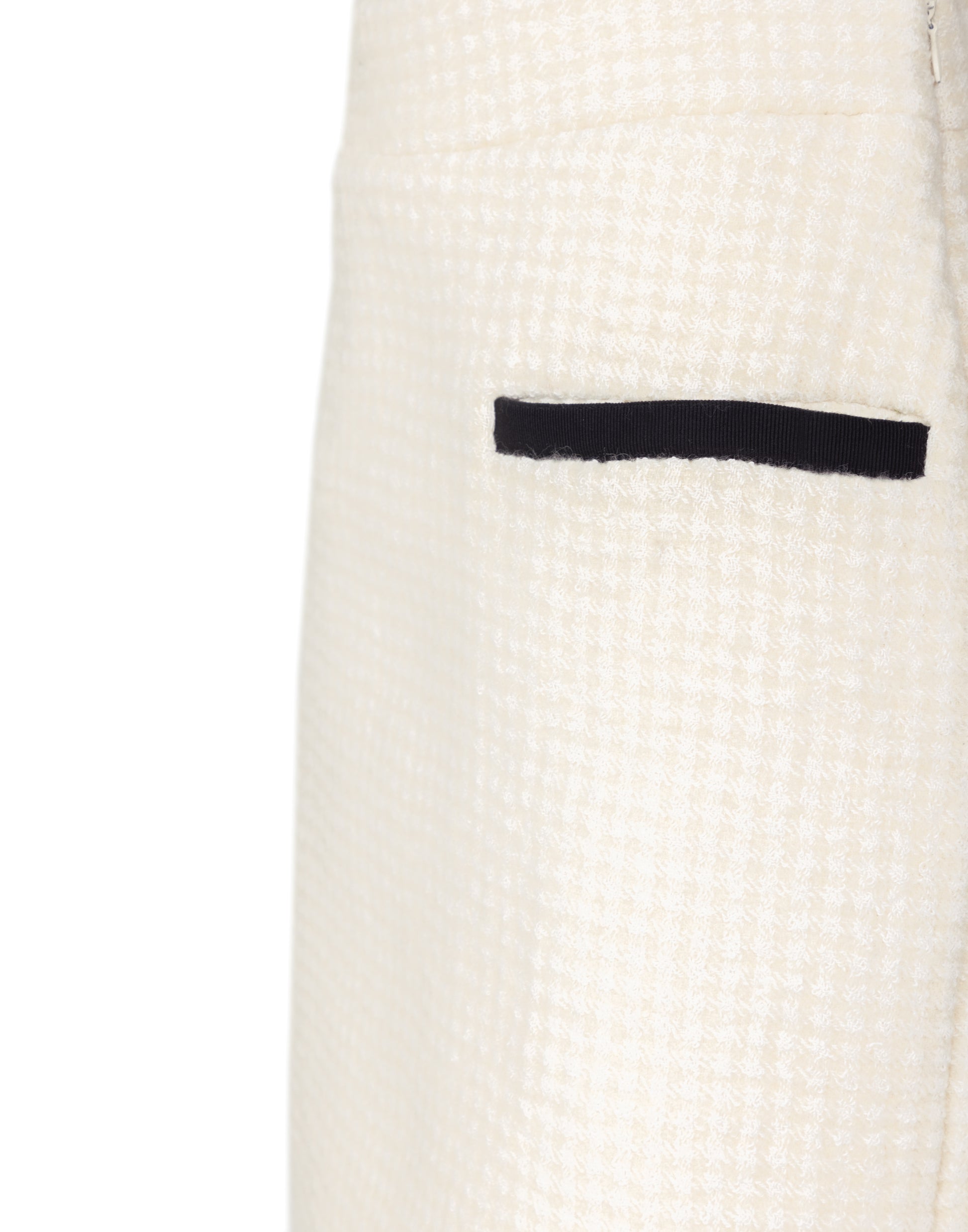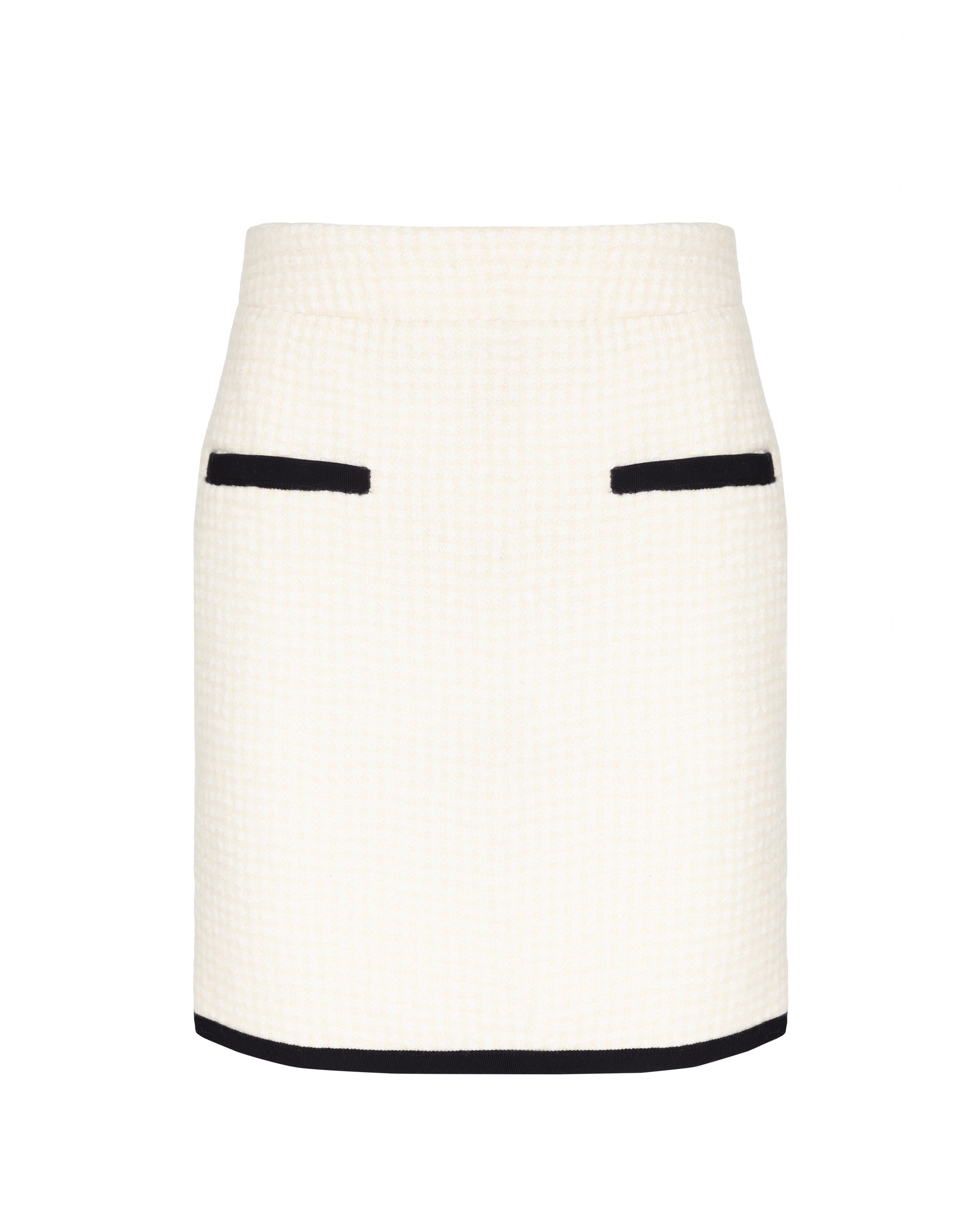 Elegant tweed mini skirt with black velvet grosgrain framing the edges. Inside strap and hidden zipper at center back, flush edged pockets.
