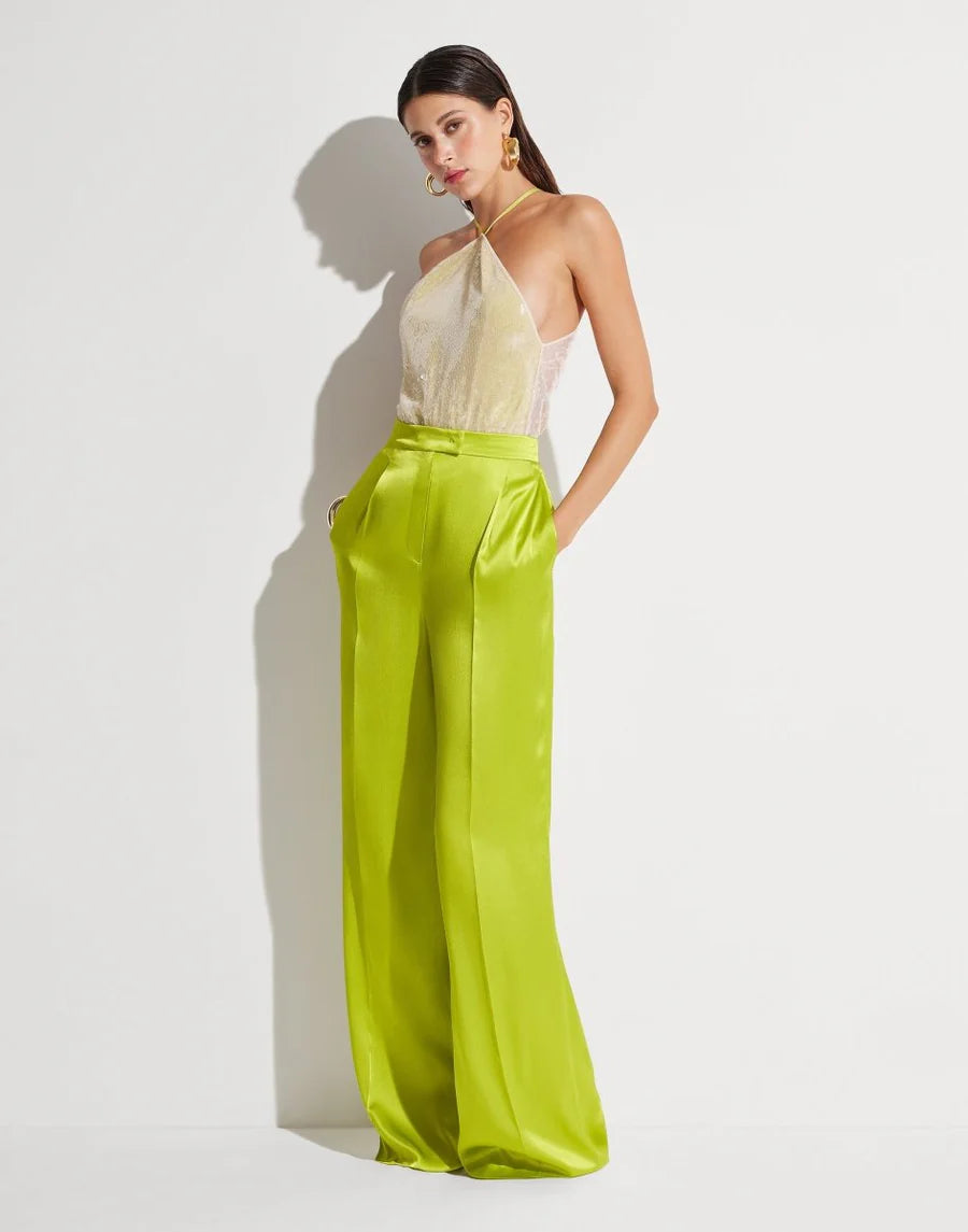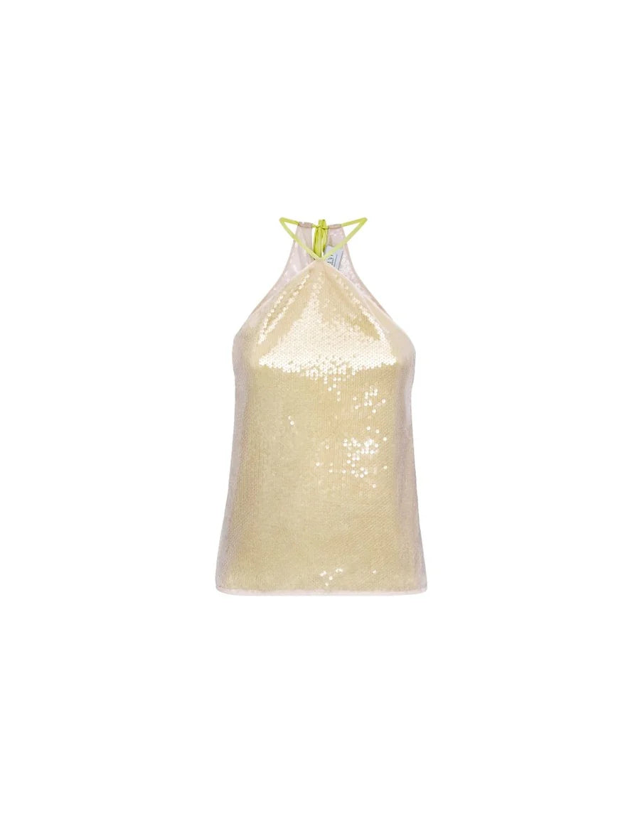 Sheer sequin top with a contrasting color front. Halterneck with satin tie and bow closure. Fitted fit.