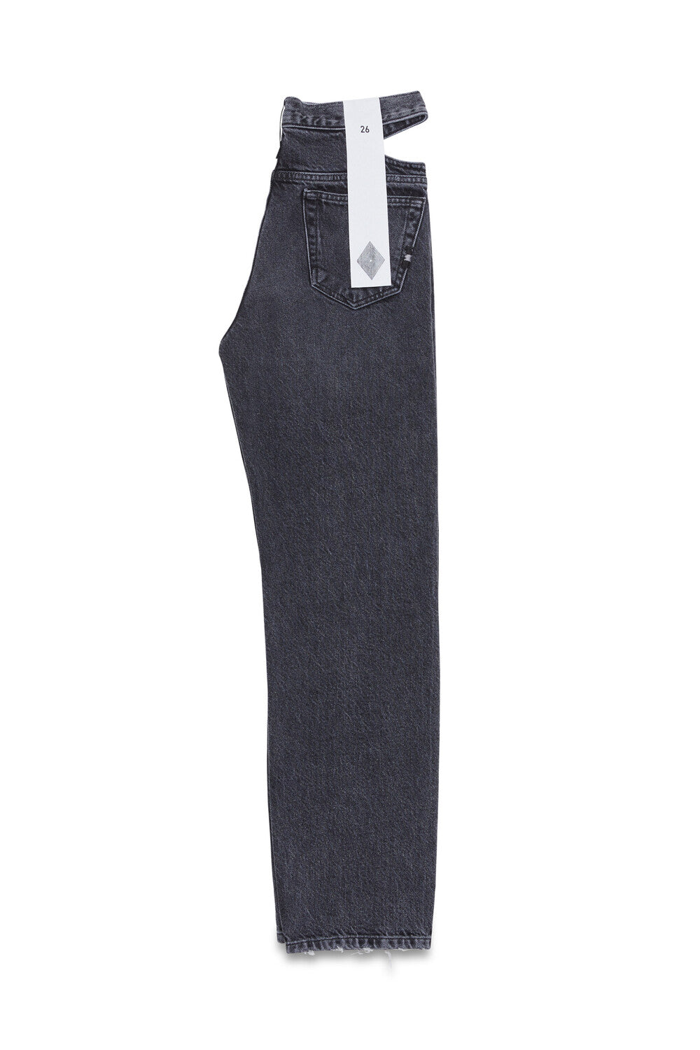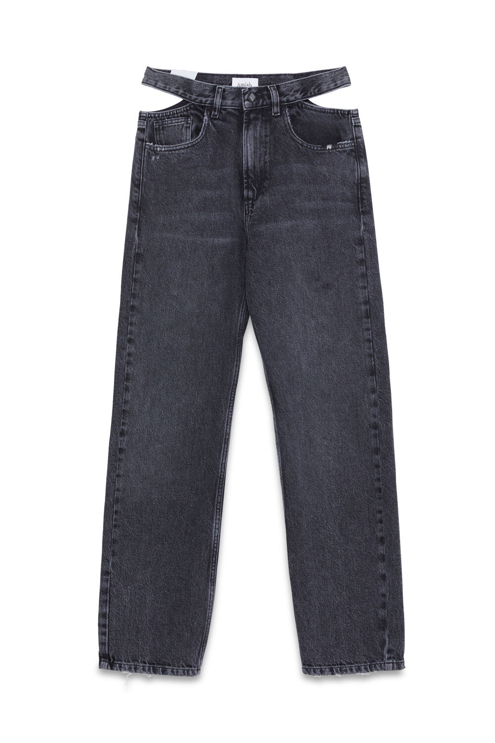 Lorena Jeans in graphite denim. High waistband with cut-out side detailing, loops and iconic logoed fabric loop at back. Zipper and logo button closure. Two pockets at front, two pockets at back with contrast thread embroidery. Used-effect hem. Straight fit.