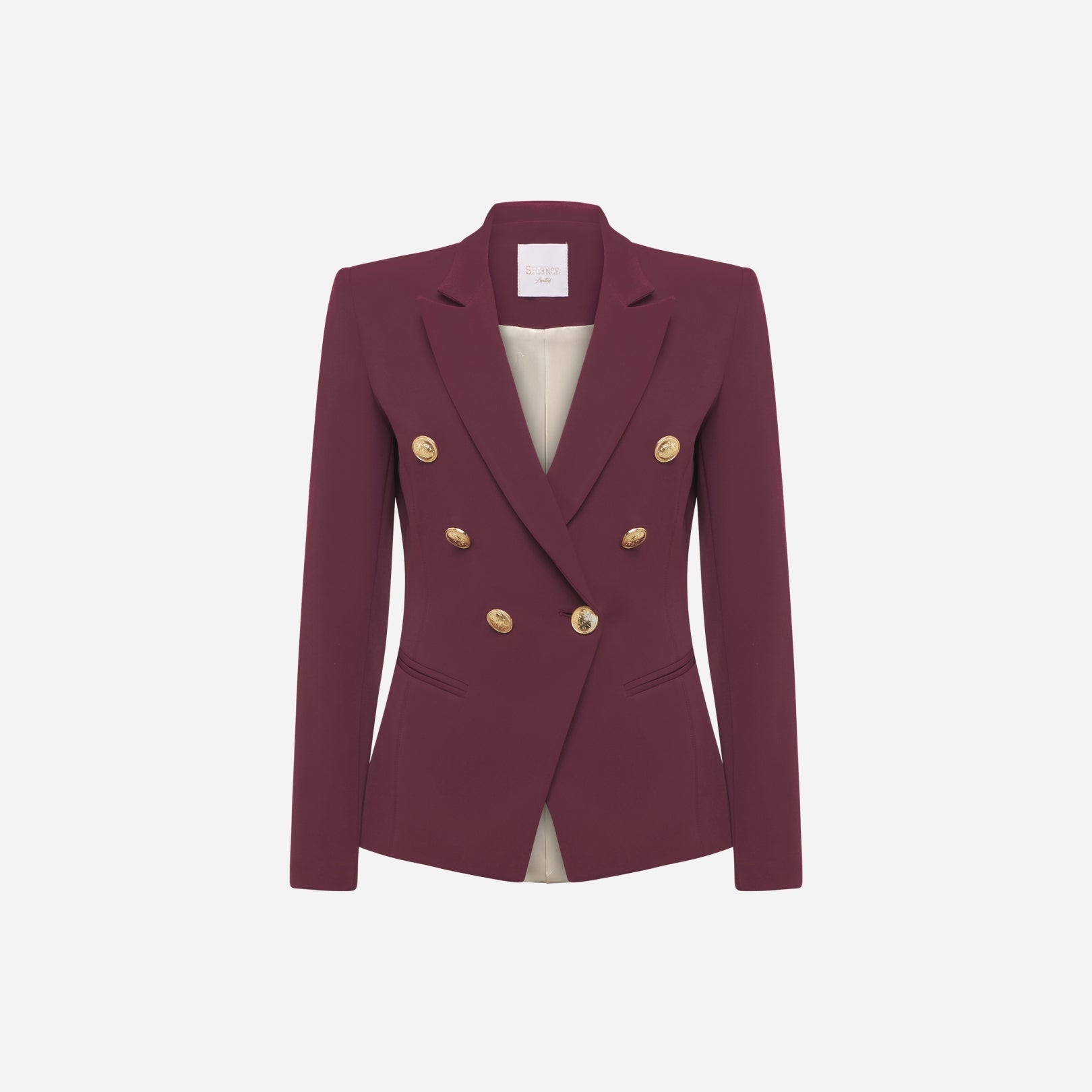A bold and elegant must-have from Silence Limited. The Libra Blazer is crafted from high-quality technical fabric with structured shoulders and peak lapels. Its semi-fitted silhouette and double-breasted closure enhance the figure with refined sophistication. Fully lined and finished with side welt pockets, this piece is perfect for formal occasions or statement looks. Made in Italy.