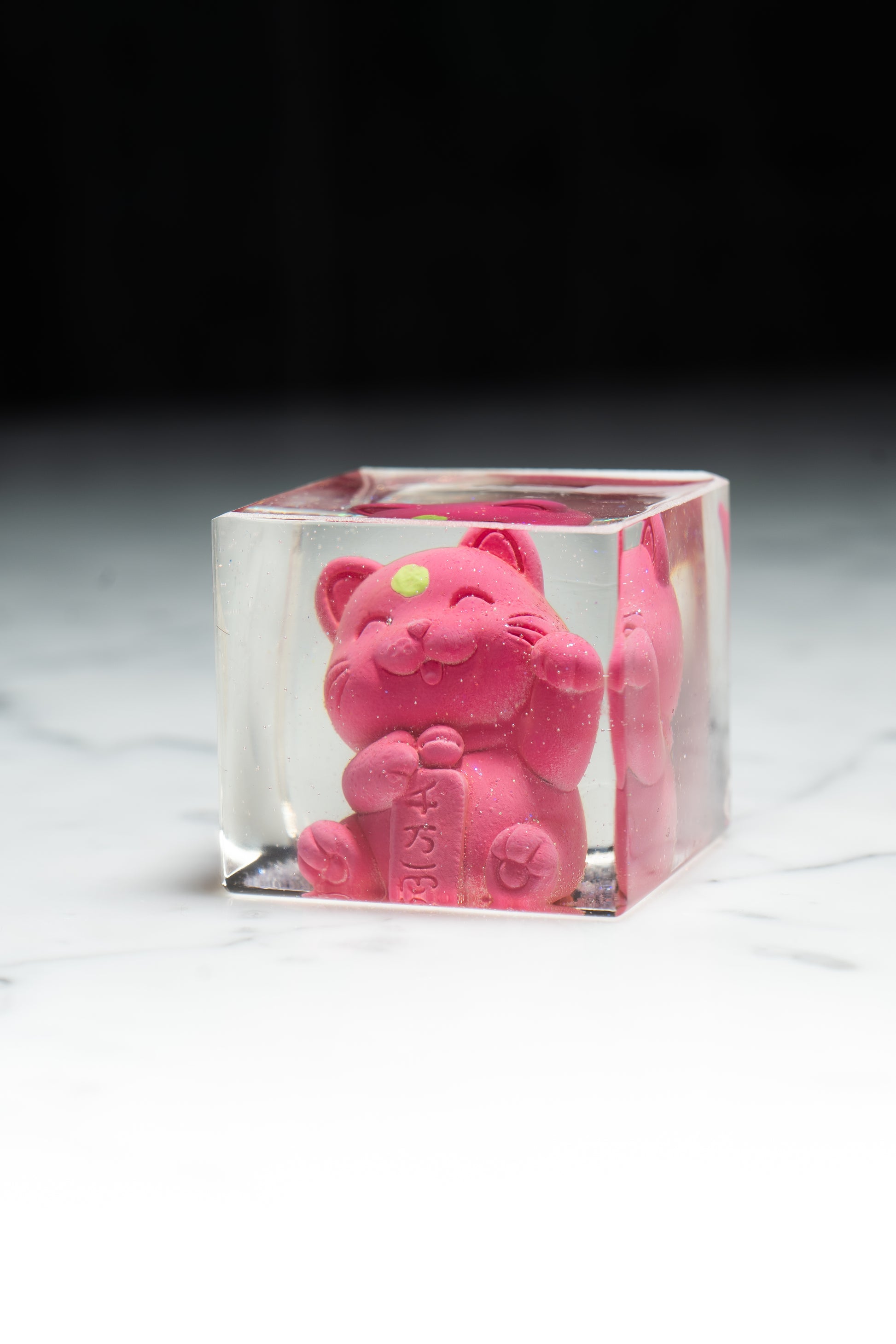 Lucky kitten are made of cement mortar, spray paint, oil color, glitters and resin. Also the base is hand made on wood and paper.