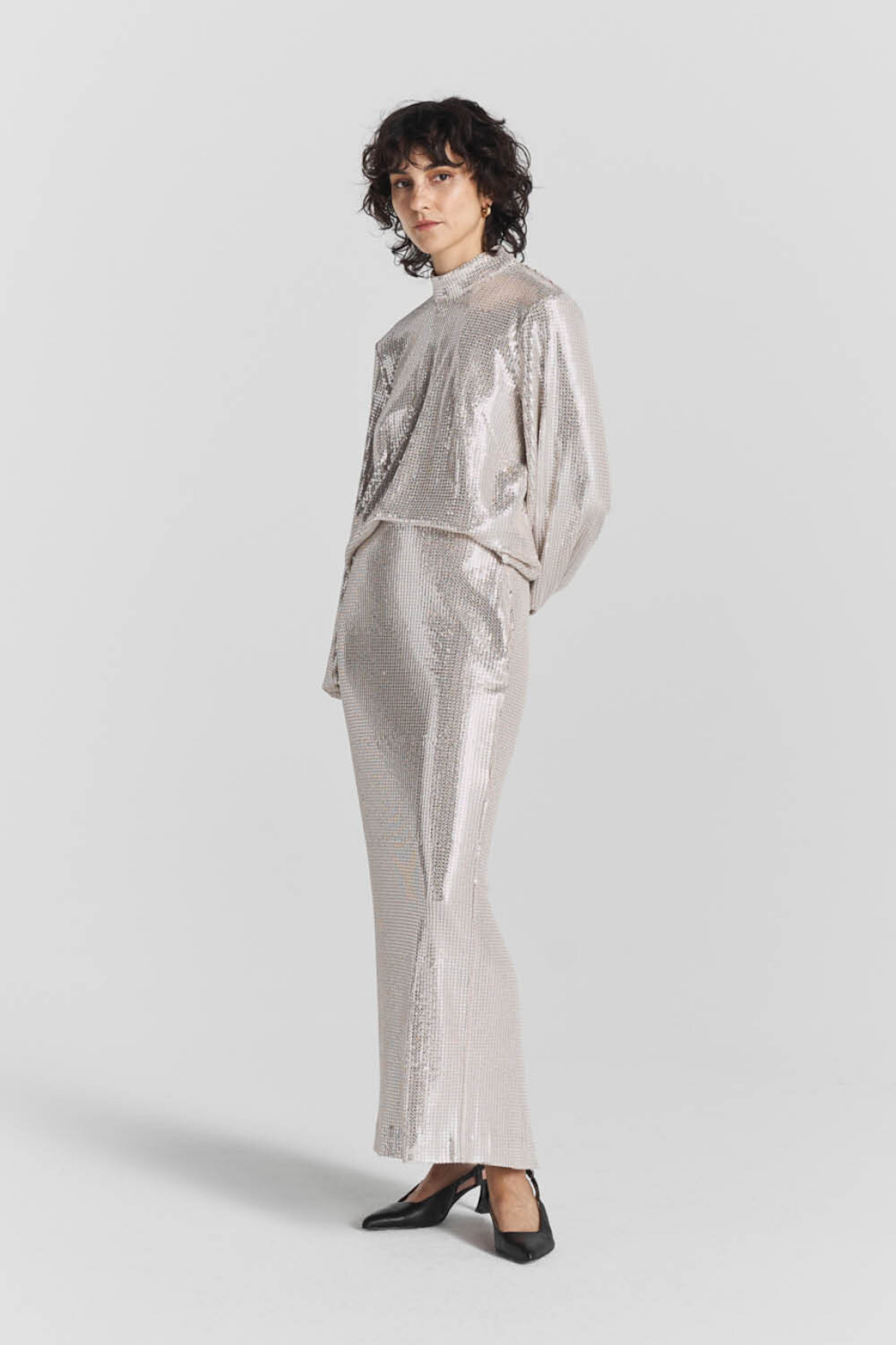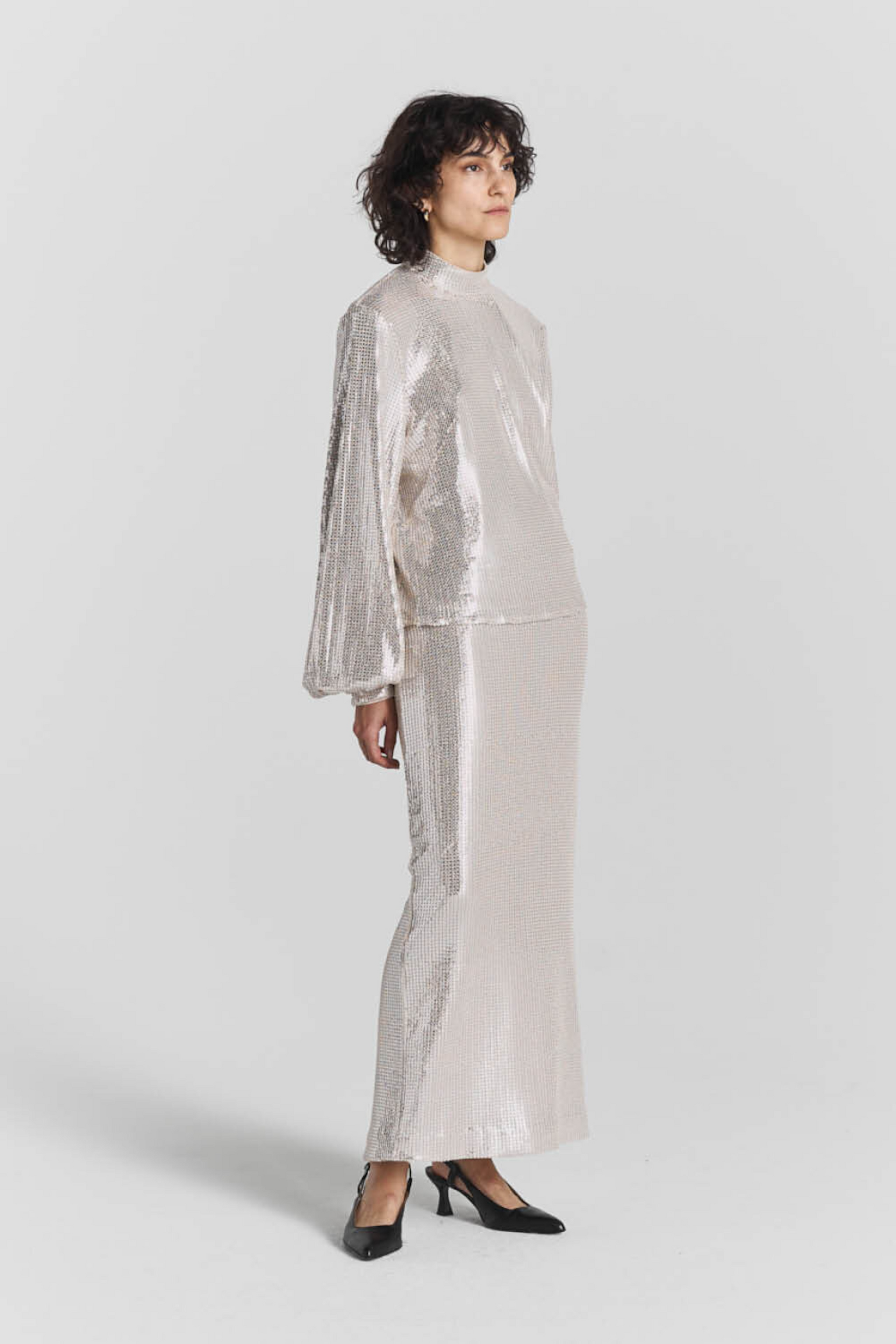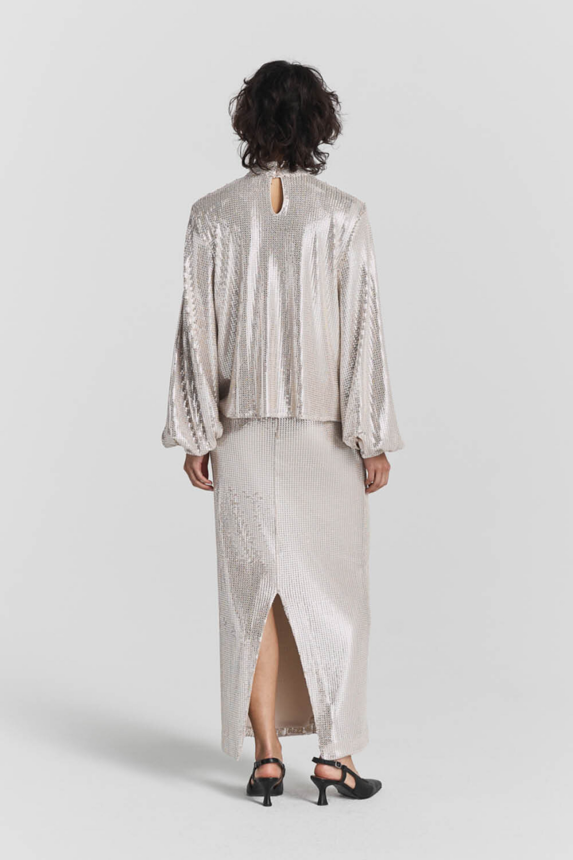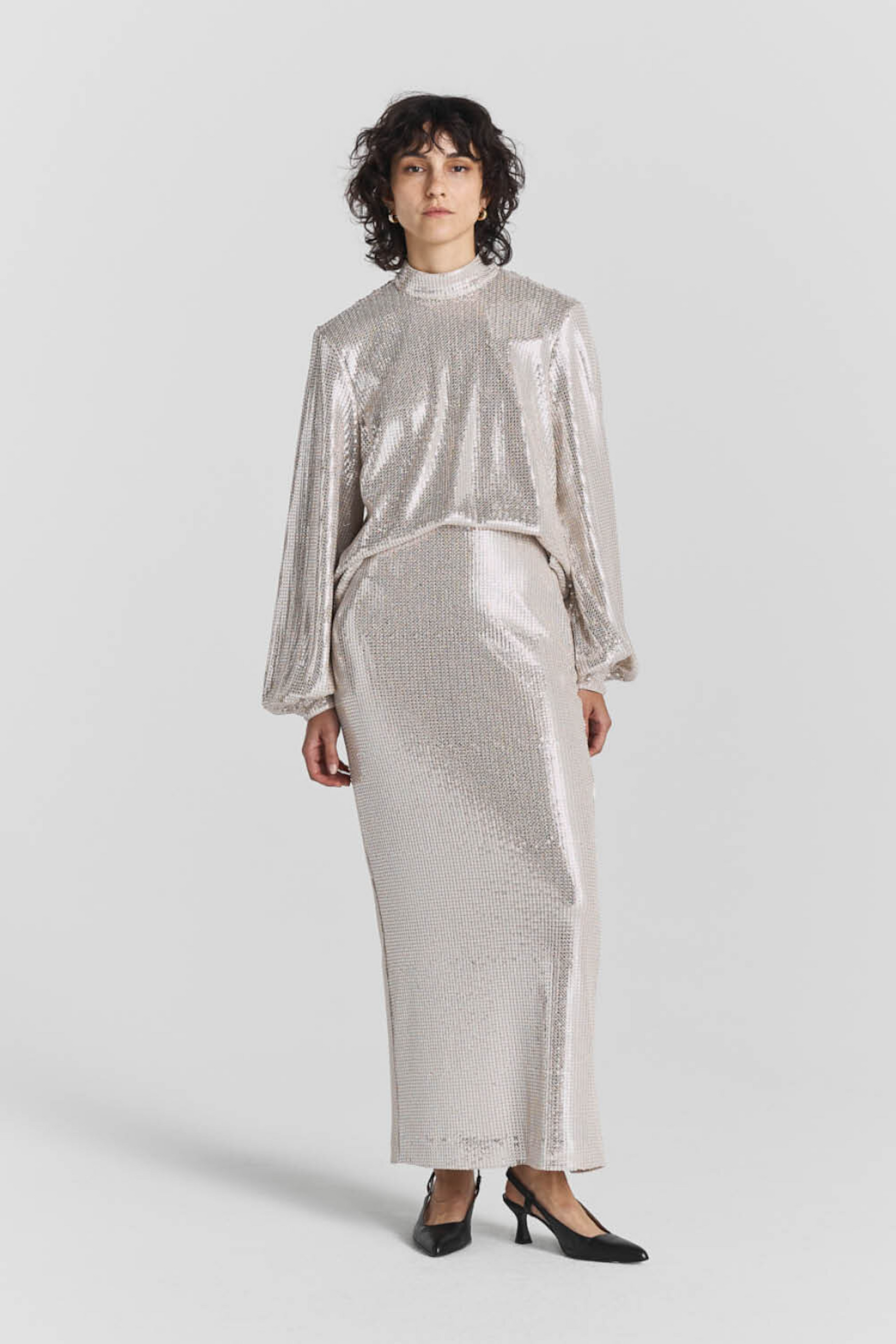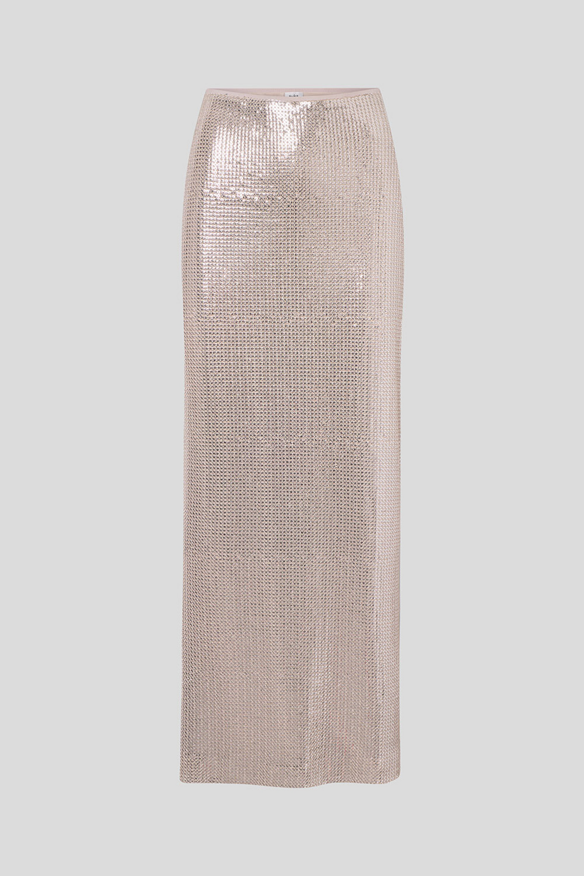 Introducing our Georgia Skirt, a shimmering sensation. Adorned with sequins, it features a flattering column silhouette, elastic waist, hidden side zip, slit back, and fully lined.