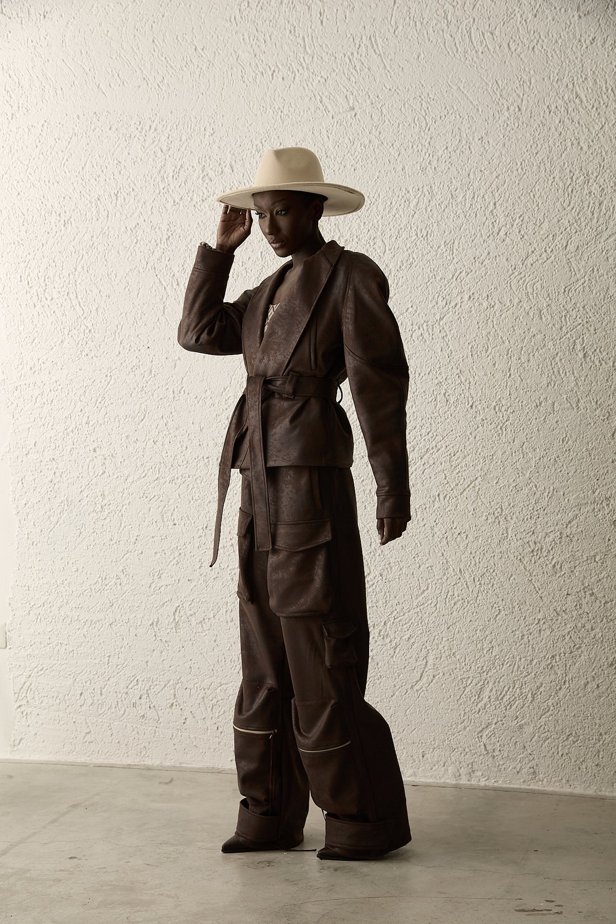 A brown eco-leather blazer with a vintage-inspired finish and a bold, structured design. Featuring classic lapels, slightly shaped shoulders, and a tone-on-tone belt that enhances the waistline. The textured material adds an edgy yet refined allure, perfect for urban-chic looks. Made in Italy.
