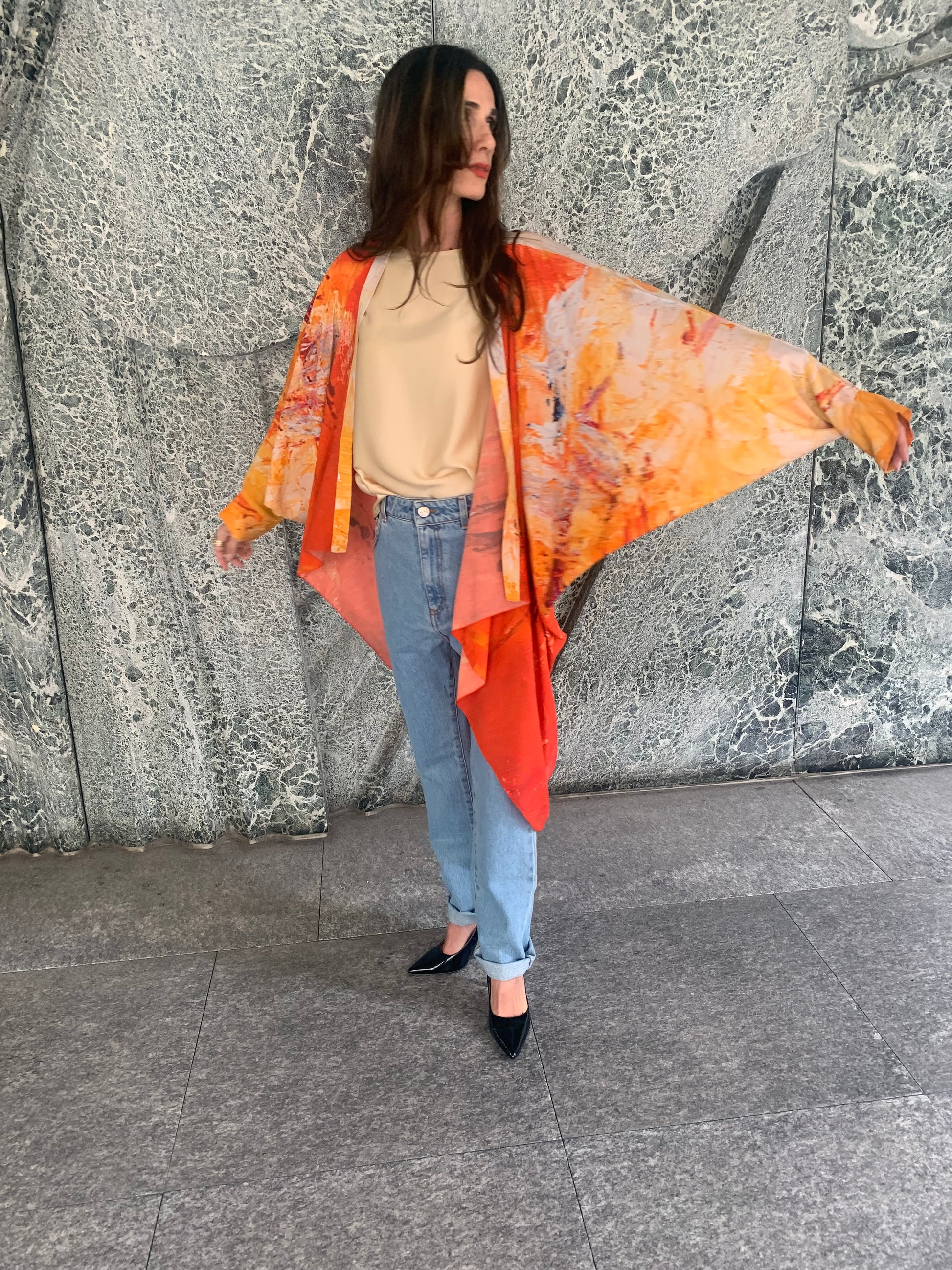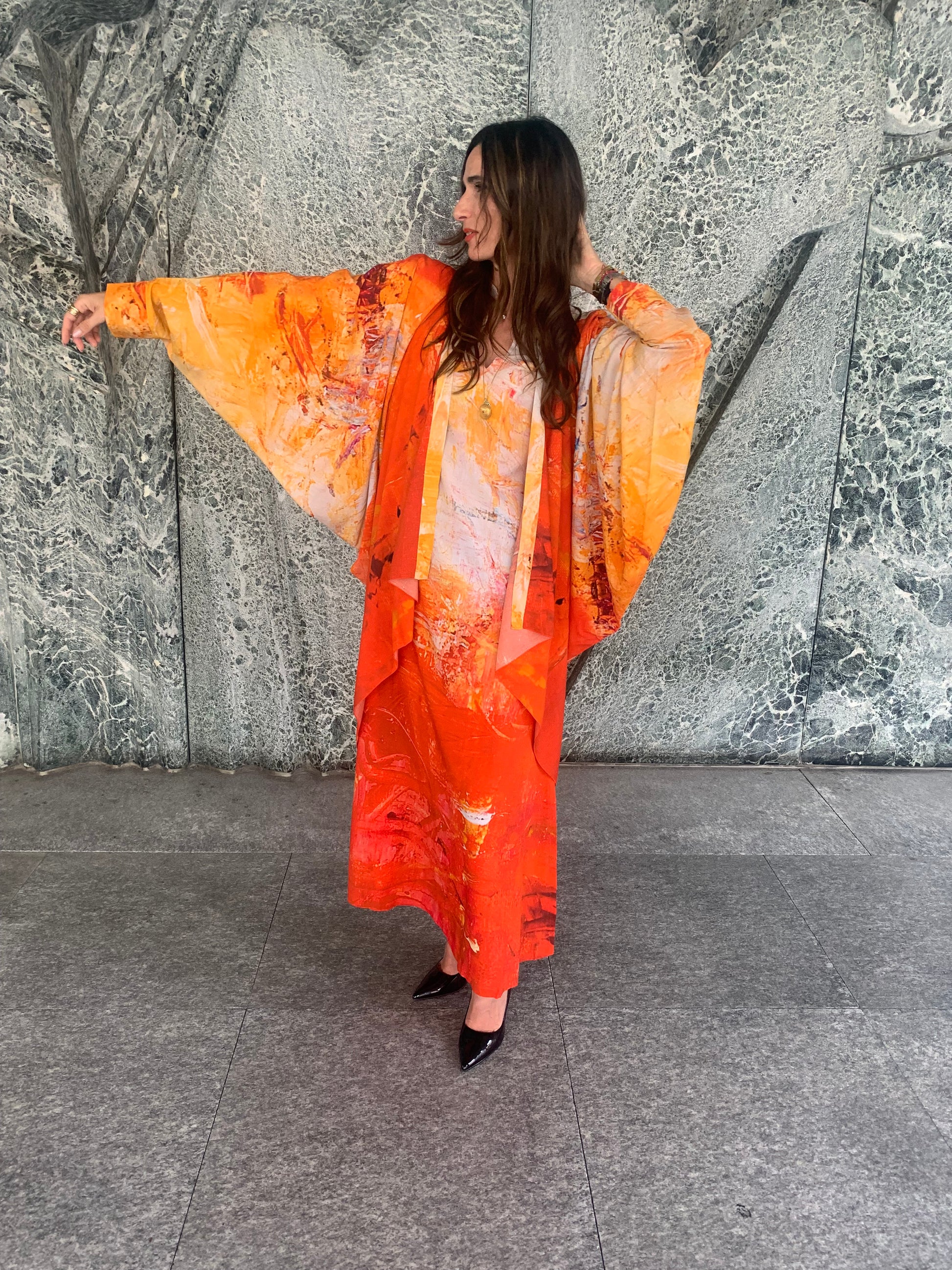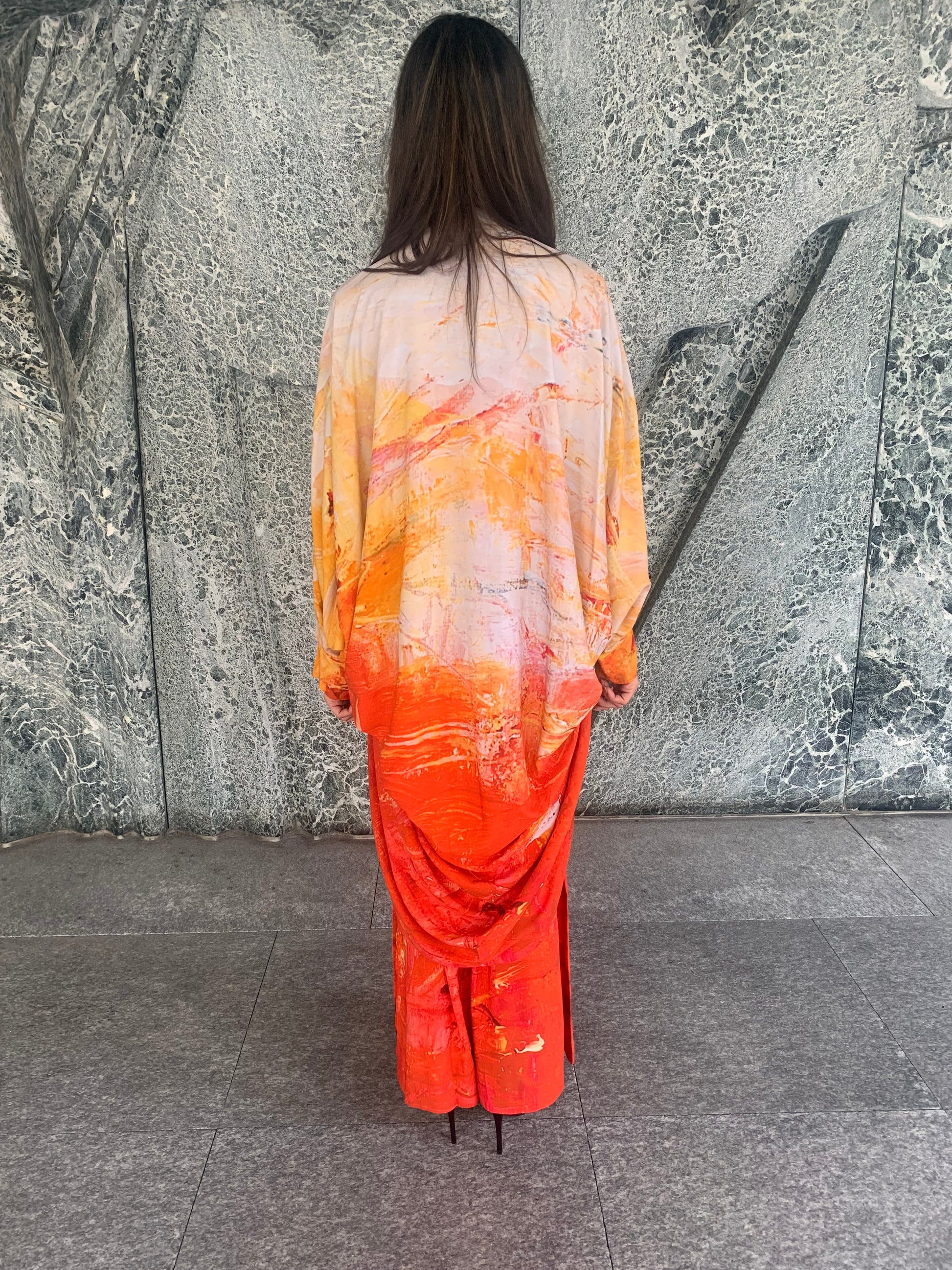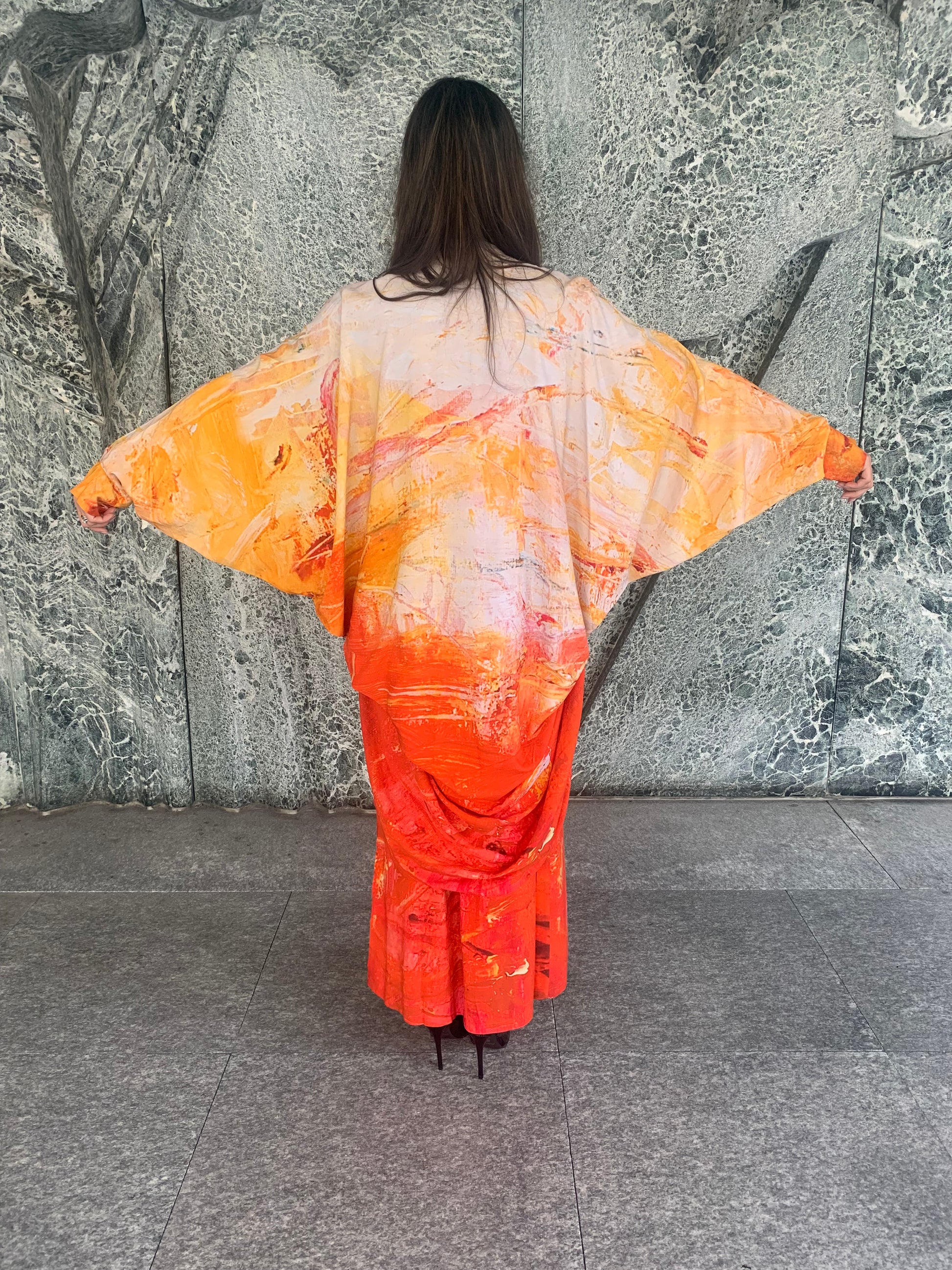 Long Kimono with wide sleeves. This is a special Capsule Collection created from the painting "Expect the Extraordinary" of the swiss Artist Ilaria Ratti Salvioni.