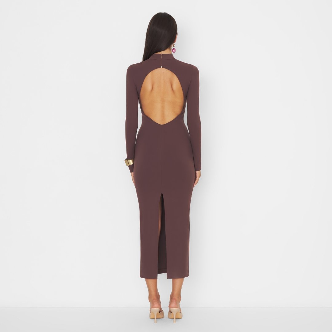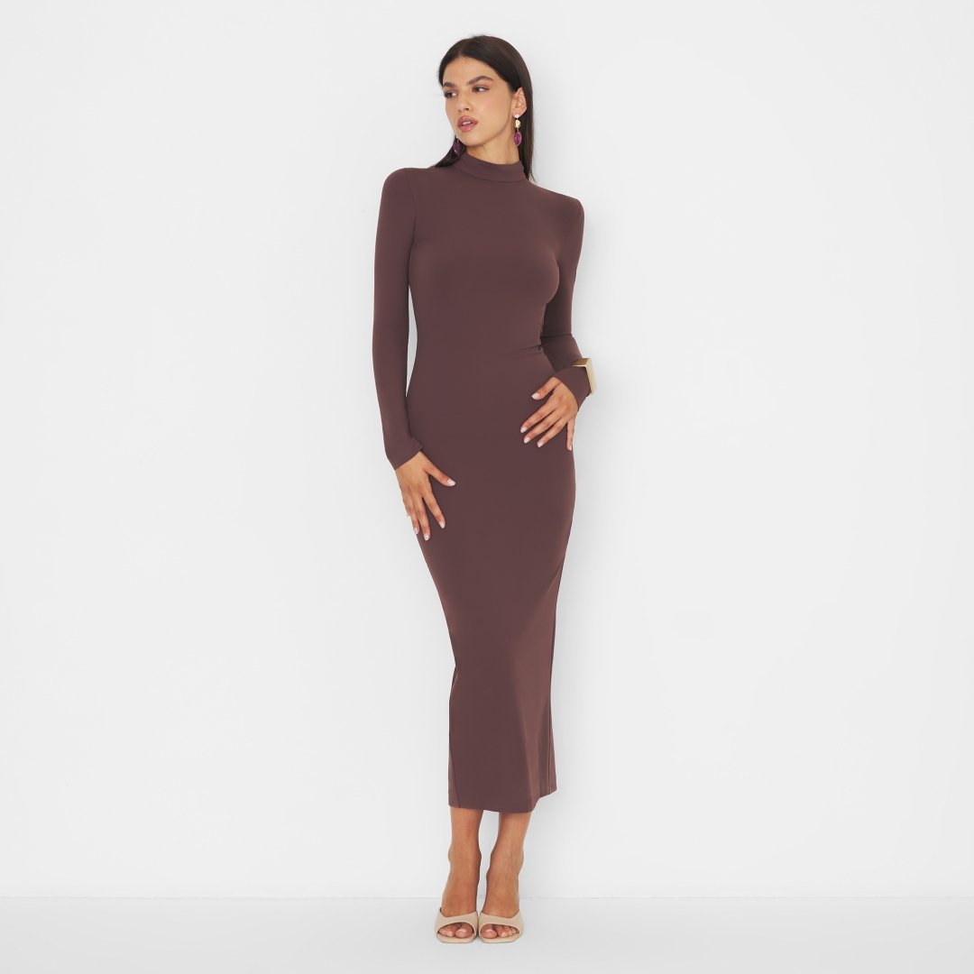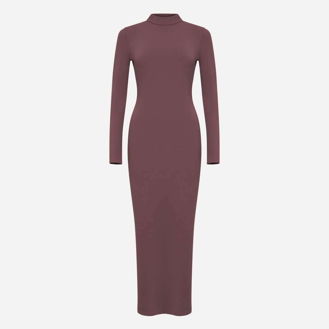 A sleek and elegant long dress that hugs the body like a second skin, crafted from soft and stretchy fabric. Featuring a high neck, long sleeves, and a dramatic back slit, it sculpts the silhouette with almost architectural precision. Ideal for those who embrace minimalist sophistication, this dress is perfect for evening events. Made in Italy.