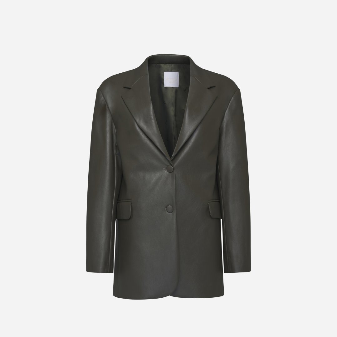 An oversized eco-leather blazer with a sleek and modern finish. The structured fit and slightly glossy texture create a sophisticated, urban-chic look. Featuring front tonal button closure and flap pockets, this piece is perfect for minimalist or stylish urban outfits. Made in Italy for exceptional quality.