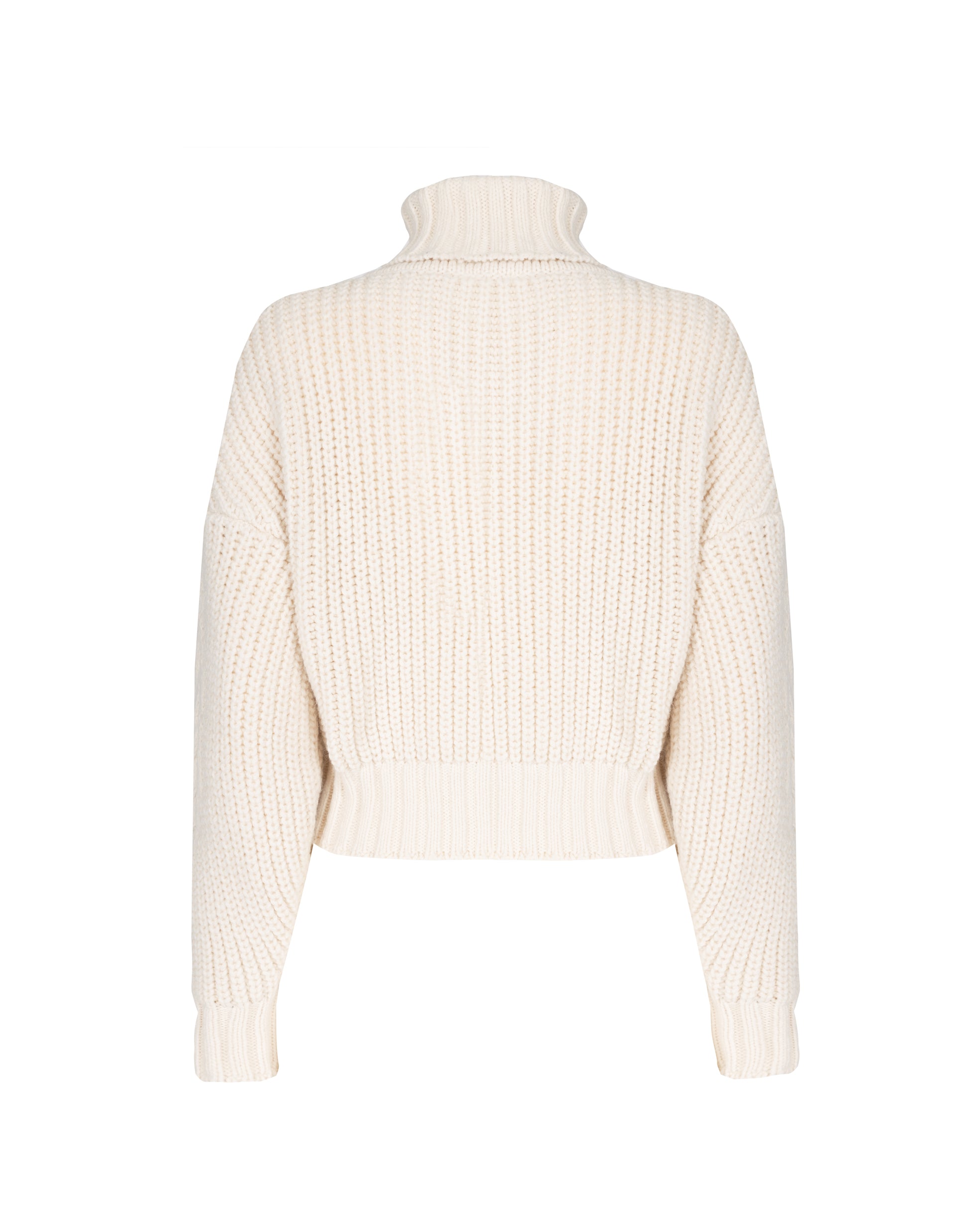 High collar sweater with double-rib double yarn fineness 3, and balloon sleeves with high rib cuffs and hem.