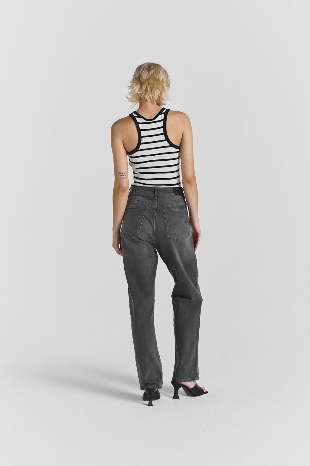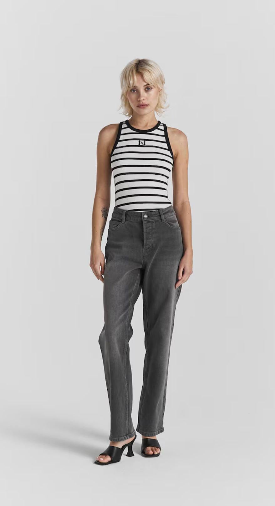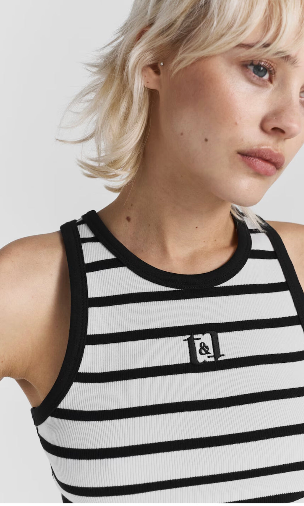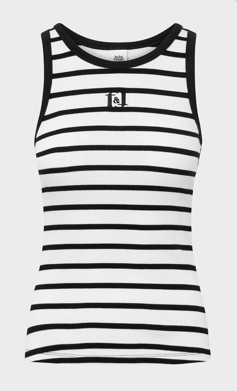 Azra is a racerback tank top in a organic cotton rib quality and a logo at the chest. It has bindings along armholes and neckline. Wear with all kinds of bottoms.